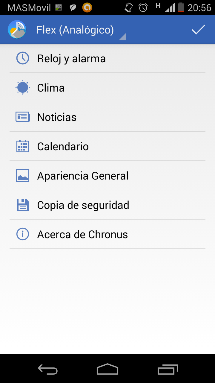 Cuando tengamos el Widget colocado, saldrá el menú de configuración. Pero siempre podemos ir a la configuración yendo al icono de aplicación y habrá una configuración para cada widget que se hayas creado, cada widget creado tendrá las opciones que este incluya. En el caso del «Flex (Analógico) 4×3» que es muy completo tendremos:
